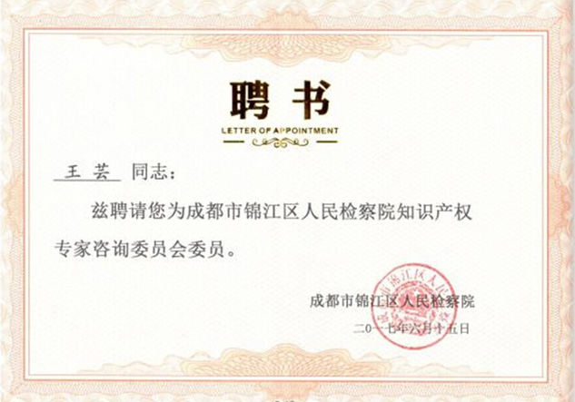 会议首先由锦江区人民检察院党组书记、检察长伍健为锦江区人民检察院知识产权专家咨询委员会委员代表颁发了聘书。我所主任王芸女士位列其中,为律所再添殊荣。