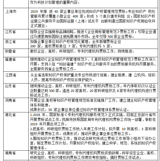 2019年5月13日,国务院知识产权战略实施工作部际联席会议办公室发布了关于印发《2019年地方知识产权战略暨强国建设实施工作要点》的通知。本文将通知中的2019年全国各省市开展知识产权贯标工作的要求做了整理,以供参考交流。