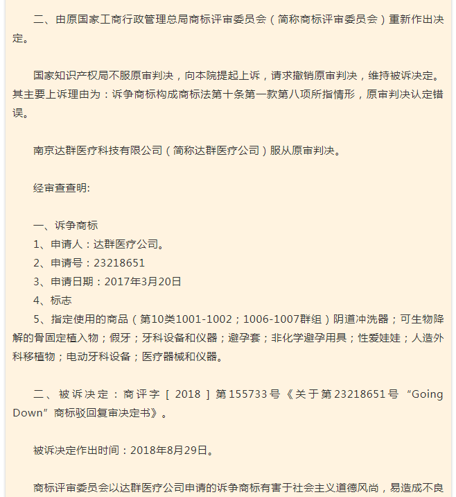 据了解,该商标在2017年12月就被商标局以“Going Down”与“够淫荡”接近,有害于社会主义道德风尚,易造成不良社会影响为由,予以驳回。随后,南京达群医疗科技有限公司(下称“达群公司”)申请了驳回复审程序。