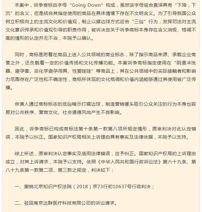 北京高院认为:诉争商标由字母“Going Down”构成,虽然该字母组合直译具有“下降,下沉”的含义,但是结合其指定使用的商品在具体情境下存在不文明含义。为了引导我国公众树立积极向上的主流文化和价值观,制止以擦边球方式迎合“三俗”行为发挥司法对主流文化意识传承和价值观引导的职责作用,被诉决定关于诉争商标本身存在含义消极、格调不高的情形的认定并无不当,本院予以确认。