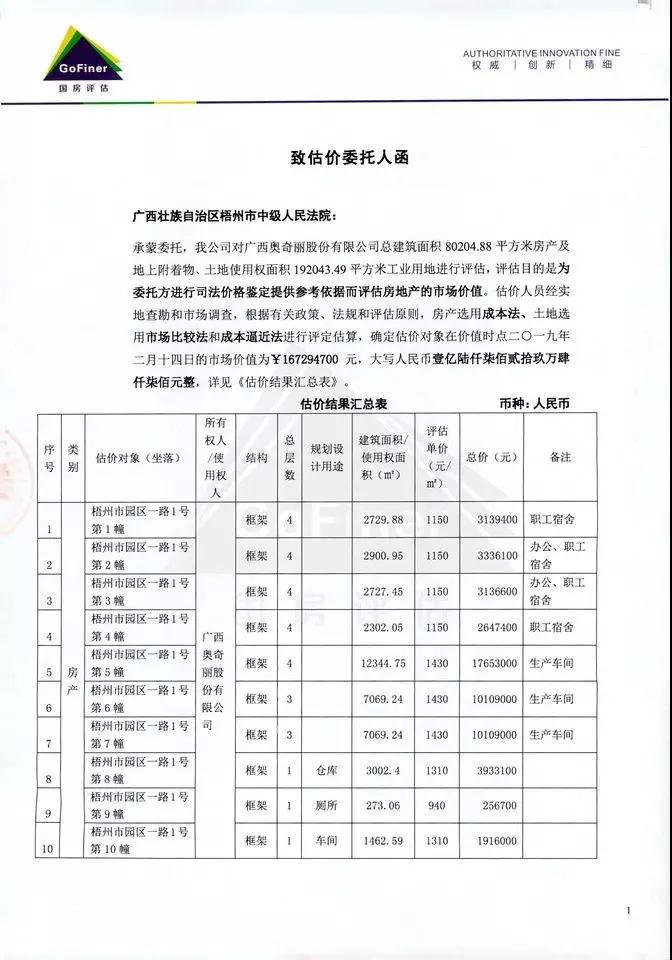 本月月初,人民法院诉讼资产网发布了梧州市中级人民法院关于广西奥奇丽股份有限公司房地产,生产设备,“田七”商标整体拍卖(第一次拍卖)的公告。该公告于2019年5月10日由梧州市中级人民法院公布,公告中显示,第一次拍卖时间为2019年6月11日10:00至2019年6月12日10:00止(延时的除外),当次拍卖流拍的,进行第二次拍卖;当次拍卖成交的,后续拍卖自动取消。第二次拍卖竞价时间尚未确定。拍卖标的物包括广西奥奇丽股份有限公司所有的位于梧州市园区一路1号土地使用权、梧州市旺甫外向型工业园区A7、A8土地使用权及地上的房屋、建筑物;生产设备(牙膏、湿巾)以及“田七”57个商标。这些财产评估总价为2.3320616亿元。