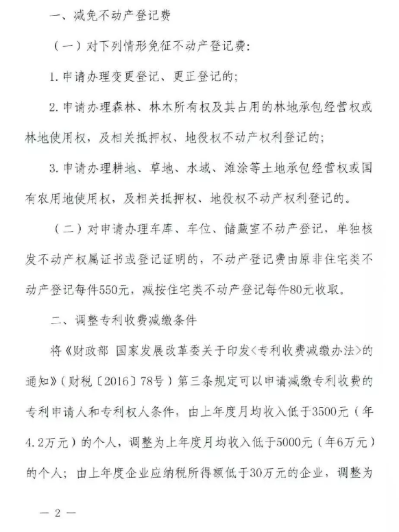 将《财政部 国家发展改革委关于印发〈专利收费减缴办法〉的通知》(财税〔2016〕78号)第三条规定可以申请减缴专利收费的专利申请人和专利权人条件,由上年度月均收入低于3500元(年4.2万元)的个人,调整为上年度月均收入低于5000元(年6万元)的个人;由上年度企业应纳税所得额低于30万元的企业,调整为上年度企业应纳税所得额低于100万元的企业。