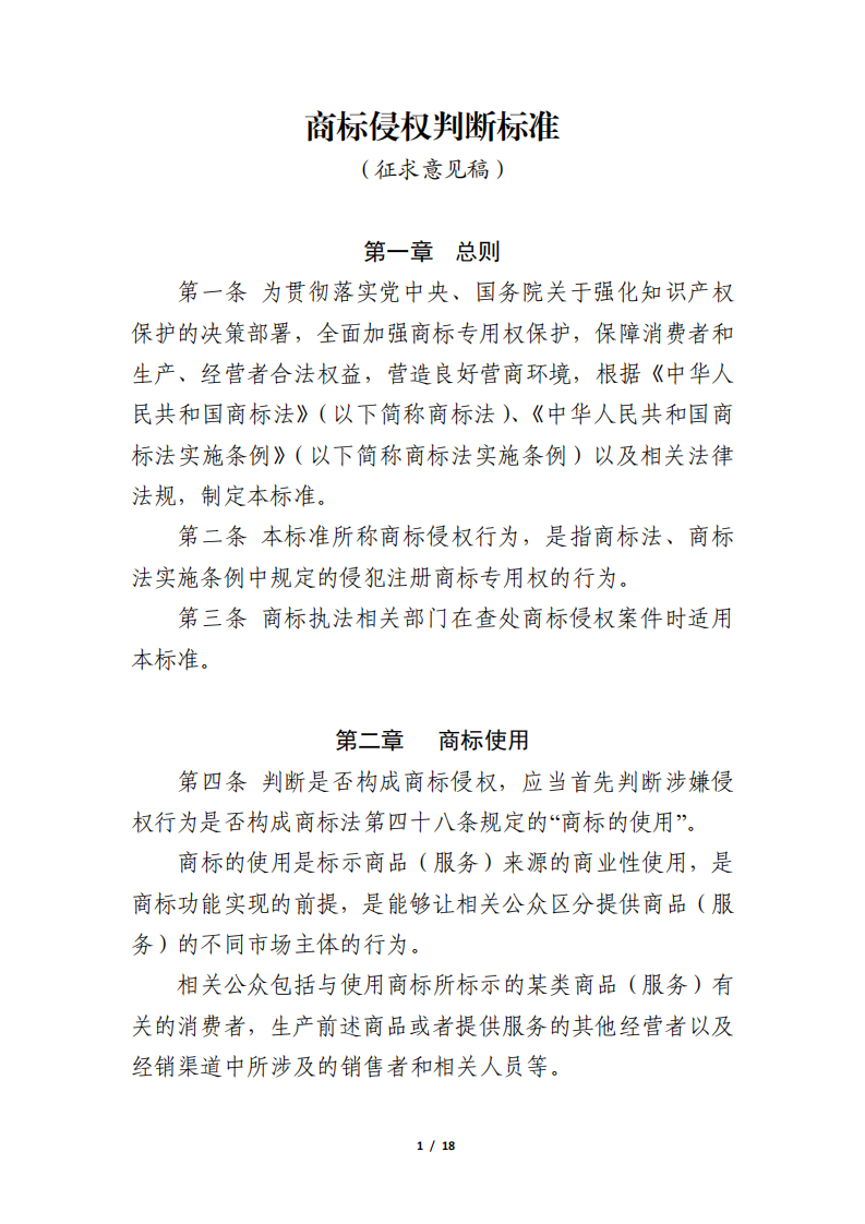 关于就《商标侵权判断标准 (征求意见稿)》公开征求意见的通知
