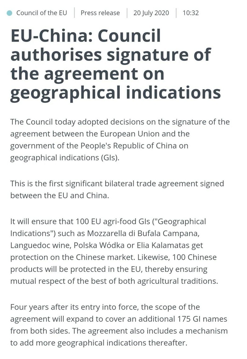 欧盟理事会当地时间20日做出决定,授权正式签署中欧地理标志协定。
