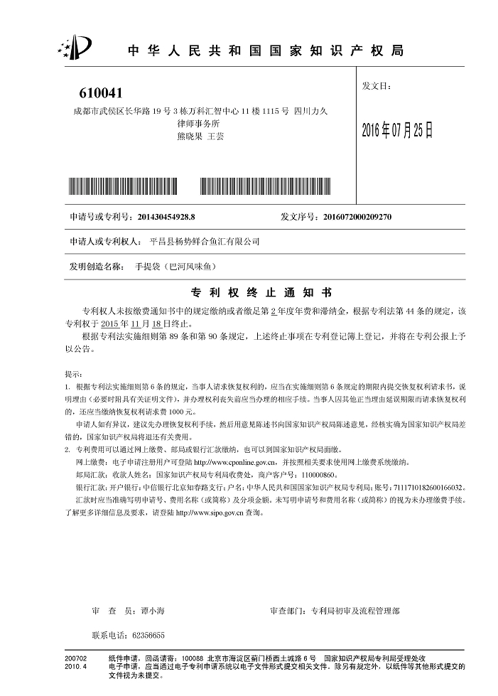 您好,我们律所于2016年7月25日收到国家知识产权局发来关于贵公司七项专利的专利权终止通知书(专利详情请查看附件),由于贵司未留联系邮箱,留的联系人电话也无法接通。现公示告知,如果在通知书规定的恢复期限前5个工作日前未收到贵司的书面指示(指示函请传真至:028-62011113),我们将视为贵司放弃委托我们办理附件中专利权恢复事宜,为此导致专利权失效由贵公司自行负责!