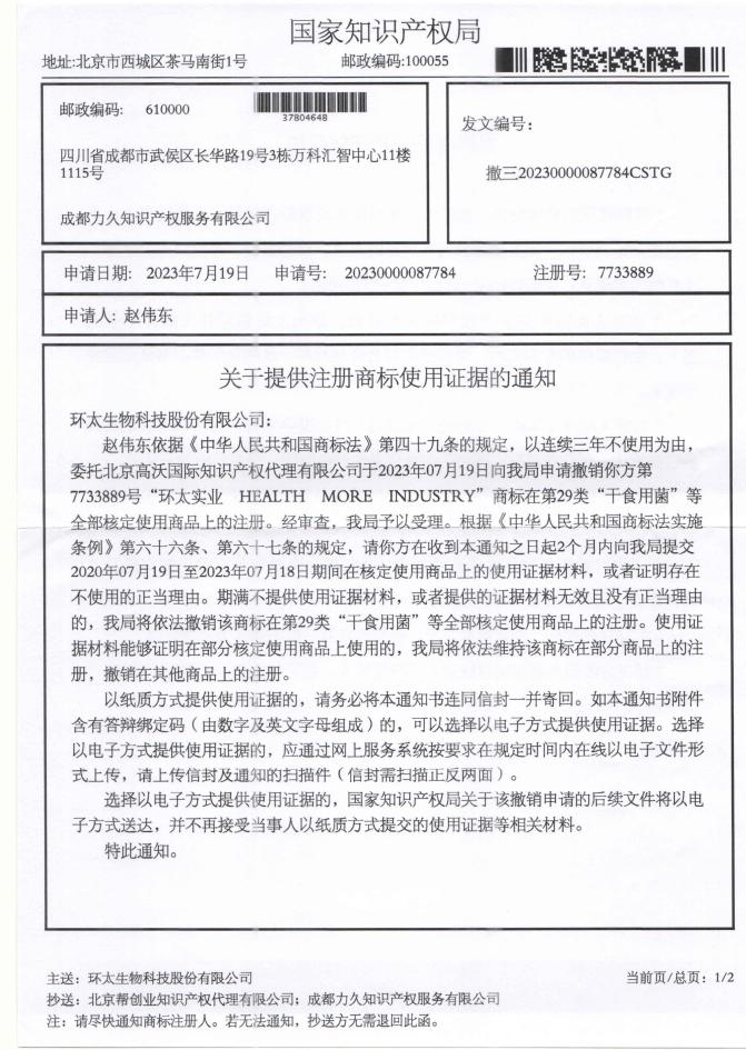 环太生物科技股份有限公司——关于提供注册商标使用证据的通知