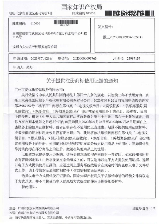 广州市爱优乐婚姻服务有限公司——关于提供注册商标使用证据的通知