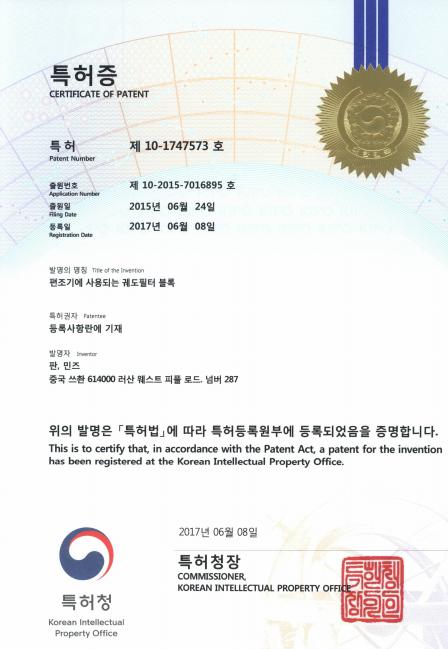 2017年6月8日,由我所专利代理人韩洋代理的《Track filter block for braider》PCT申请获得韩国专利授权。该项专利从申请到授权历时2年,由成都先进功率半导体股份有限公司研发,涉及一种用于编带机的轨道过滤块,用于在二极管生产过程中对二极管进行检测工序前的整理。该项专利在韩国的授权推动了申请人在海外的专利推广,也为申请人下一步海外专利布局奠定了基础。