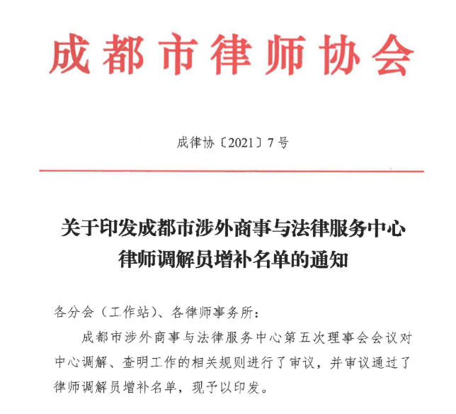 为进一步优化成都市法治化营商环境,借助律师民商事纠纷化解力量,近日,成都市涉外商事与法律服务中心发布《关于印发成都市涉外商事与法律服务中心律师调解员增补名单的通知》。四川力久律师事务所王芸主任、曹晋玲律师获聘。